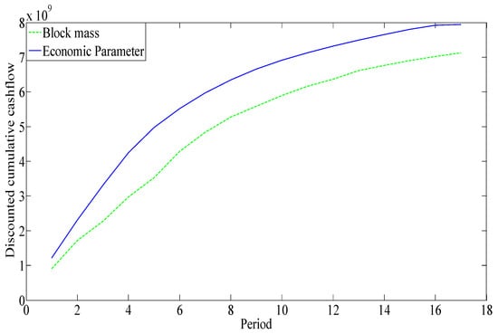 The existing model’s undiscounted cumulative cash flow and the proposed model’s undiscounted cumulative cash flow were compared, and the results showed that the proposed model can generate 2% more cash flow than the existing model. The undiscounted cash flow, on the other hand, does not account for the time worth of money. When compared to undiscounted cash flow, the outcome can be misleading. As a result, the discounted cash flow for the existing model and the proposed model was calculated and shown in Figure 16. The discounted cash flow calculation employs a 10% discount rate. The results show that the new model generated around 10% greater cash flow than the existing model. As a result, if economic parameters are available, it is always preferable to execute production planning and ultimate pit limit calculation using those values.