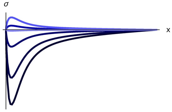 Evolution of the “classical” part of the non-stationary stress field, which corresponds to the roots , , and in the solution (33). The colormap goes from dark to light over time.
