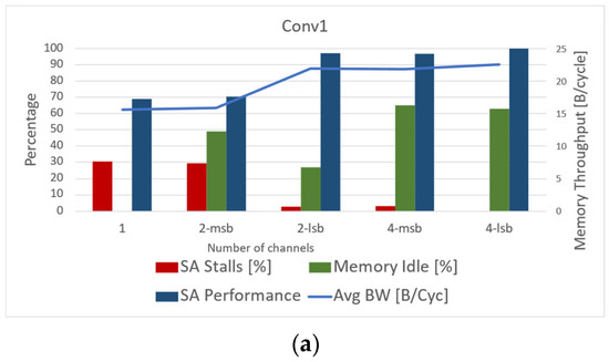 Figure 10 summarizes the simulation results for all the convolution layers in Table 3. It can be seen that, when increasing the number of channels, the overall main memory system bandwidth is increased, the SA performance is improved, and the number of SA stalls is reduced. In addition, it can be observed that LSB channel mapping achieves better performance than MSB channel mapping for all convolution layers. A deeper insight into the principles of channel mapping operation is illustrated in Figure 11. The LSB mapping improves the main memory throughput at batch level. This improvement is achieved due to the fact that consecutive memory accesses within a batch are mapped to different memory channels. As a result, the effective throughput for a batch is increased by a factor of the number of channels. On the other hand, MSB mapping is useful when batches are mapped into different channels and, as a result, it reduces the likelihood of batch conflicts. The insight into the mechanisms of channel mapping explains the experimental results presented in Figure 10, where it is clearly observed that the four memory channels with LSB mapping achieves the best performance in all convolution layers. The speedup in the overall batch access time enables the SA to reach the maximum possible performance. The most noticeable speedup in the SA performance is achieved in the conv1 and conv2 layers, since, in this use case, they require the highest memory bandwidth in order to avoid SA stalls (as illustrated in Figure 10). In this case, the four channels with LSB mapping gains over 40% improvement in SA performance relative to a single memory channel. When the number of channels increases, this not only helps improve the SA performance, but also increases the overall memory system performance. The total number of bytes prefetched from the system remains the same regardless of the number of channels; however, as the number of channels increases, the overall memory access time becomes smaller and, thereby, the throughput is improved significantly. The experimental results reported for this use case correspond to prior studies in other applications, such as [36], where the authors have analyzed the performance of different multithreaded benchmarks for multi-channel DRAM. Their study has reached similar conclusions, indicating that consecutive memory accesses benefit from the multi-channel DRAM rather than arbitrary random accesses.