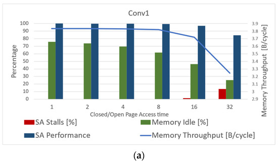 Figure 12 summarizes the simulation results for all the convolution layers in Table 3. It can be observed that, as the ratio of closed-page access time to open-page access time increases, the main memory throughput decreases alongside an increase in SA stalls and decrease in the percentage of time the memory system is idle. This is due to the fact that, the longer it takes to access a closed page, the effective main memory throughput decreases, i.e., the handling of batches takes longer and the likelihood of the main memory system to meet the SA deadline decreases.