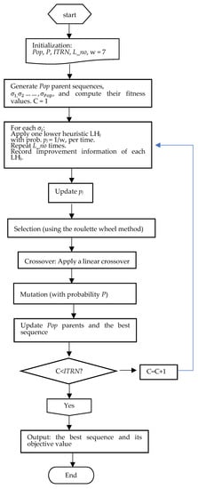 In the following, a GA-based hyper-heuristic is applied to solve this problem by identifying problem-solving methods instead of directly finding solutions to the problem (refer to Cowling et al. [47] and Anagnostopoulos and Koulinas [48]). Hyper-heuristic processes have a high level of strategy and a low level of a group of heuristics that is used to determine a low-level heuristic to produce a new solution. Moreover, seven low-level heuristics are proposed on the basis of candidate variation operators such as the two-job swap heuristic, one step (or two steps) to the right heuristic, one step (or two steps) to the left heuristic, pulling-out and onward-moved reinsertion heuristic, and pulling-out and backward-moved reinsertion heuristic. Many studies have indicated that the two-job swapping method represents an effective improved scheme. To explore diverse search solutions, the randomly determined neighborhoods of a current job must be explored as well. They are recorded as LH1, LH2, …, and LH7. The details of the proposed seven low-level heuristics are as follows: