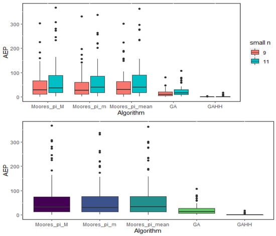 Boxplots of AEPs of heuristics and algorithms (small n).