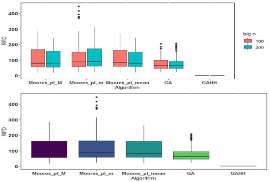 The boxplots of the RPDs of the five algorithms are depicted in Figure 5. The GAHH outperformed the other four algorithms when n was large. Overall, the average RPDs of the Moores_pi_M, Moores_pi_m, Moores_pi_mean, GA, and GAHH approaches were 106.68, 125.22, 105.45, 76.79, and 0.00, respectively. The experimental results further corroborated the superiority of the GAHH approach.