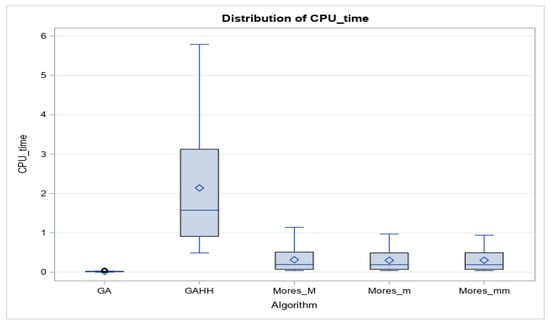 To compare the solution quality among the Moore_pi_M, Moore_pi_m, Moore_pi_mean, GA, and GAHH (with mean AEPs of 62.09, 59.44, 63.13, 19.77, and 1.22, respectively), the AEPs obtained under variations in different factors including the algorithm; number of jobs; number of machines; and the parameters λ, τ, and ρ were fitted to a linear model. The analysis of variance results for the AEP revealed significant differences in the performance of all factors when the significance level was 0.05, but the normality of the error term was significantly invalid as indicated by a Shapiro–Wilk test (with the statistic = 0.8535 and p < 0.0001). The boxplots in Figure 3 display the AEP distributions of all the proposed heuristics and algorithms. Accordingly, a nonparametric statistical method was used to perform multiple comparisons between these methods. Then, a Freidman test (with p < 0.0001) showed that the AEP samples were not followed the same distribution under a significance level of 0.05 according to the basis of AEP ranks on the 108 (n·m·λ·τ·ρ = 2·3·3·2·3) blocks of test problem instances.