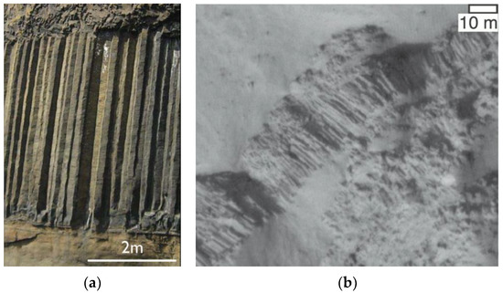 - Milazzo, M.P.; Keszthelyi, L.P.; Jaeger, W.L.; Rosiek, M.; Mattson, S.; Verba, C.; Beyer, R.A.; Geissler, P.E.; McEwen, A.S.; Hi, R.T. Discovery of columnar jointing on Mars. Geology 2009, 37, 171–174. [Google Scholar] [CrossRef]