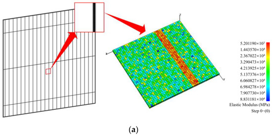 Figure 4b shows that under plane strain, in the aspect of equivalent deformation modulus (EDM), when the joint distance ratio is 0%~50%, the EDM of specimen reduces in the beginning, but changes/fluctuates with β increases later. The highest value of EDM appears when β = 0°; the lower values of EDM exist at the range of β = 45°~90°. Moreover, combined with Figure 4d, it is clear that for the CJBs with various joint distance ratios, the EDMs change in elliptical way with β increases. The EDM of the models is less sensitive to the variation in joint distance ratio, which is mainly because the compaction and elastic deformation are not sensitive to joint distance ratio.