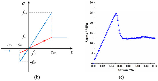 (a) The creation process of non-homogeneous numerical models; (b) the element constitution subject to uniaxial stress; (c) the stress-strain curve.
