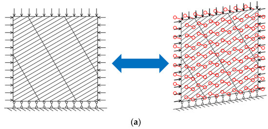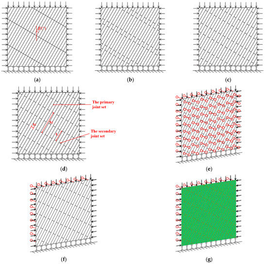 Moreover, the meso-element size of the models remains the same. For instance, the element number of the 4 m specimen is 1,081,600. The applied configuration for established CJB specimens along the direction parallel to the column axis are presented as Figure 3a–g. For Figure 3e, the normal displacement constraints are applied on the two faces. For Figure 3f, the normal displacement constraint is applied only on one face, and the other normal direction of the plane is free. For Figure 3a–g, the pre-set loading is applied onto the top surface along the vertical direction until the model failure.