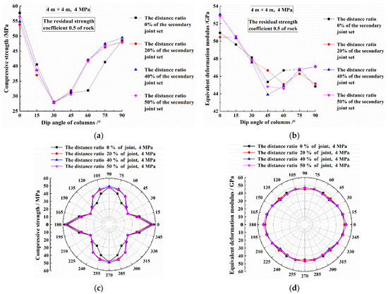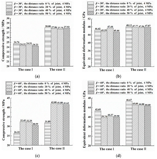 According to Figure 4a, under the lateral pressure of 4 MPa, in terms of compressive strength (CS), when the joint distance ratio is 0%, the compressive strength of specimen shows a roughly U-shaped trend as β increases; when the joint distance ratio is 20%, 40% and 50%, that changes roughly in a V-shaped trend as β increases. At β of 60° and 75°, compared with the specimen with a joint distance ratio of 0%, for the models with the joint distance ratios of 20%, 40% and 50%, the CS is risen greatly, which is caused by the obvious growth of the effective bearing area. Furthermore, combined with Figure 4c, it is clear that for the CJBs with various joint distance ratios, the troughs of CS appear at β = 30°, 150°, 210° and 330°; the peaks of CS appear at β = 0°, 90°, 180° and 270°. Additionally, for the CJBs with the joint distance ratios of 20%~50%, the CSs of specimens decrease sharply near β = 0° and 180°, which results from the rapid penetration failure of joints. However, they change relatively gently near β = 90° and 270°.
