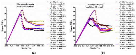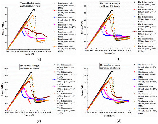 Figure 5a,b displays the loading curves of the CJBs owning various joint distance ratios when the lateral pressure = 4 MPa under plane strain. As presented in Figure 5a, when the joint distance ratio = 0%, the loading curve of the CJBs with β = 60° show ductile failure characteristic, while the loading curves of other CJBs show basically brittle failure characteristics. In addition, no residual strength stage exists on the loading curves for β = 15°, 30° and 75°, indicating that the failure and overall instability of specimen occur. As shown in Figure 5b,d, the loading curves for various column dip angles are almost with some characteristics of brittle failure. When the joint distance ratio is 20%, 40% and 50%, there is no residual strength stage in the loading curve when β = 15°, while regarding the other column dip angles, the residual strength stages exist in the loading curves. If β = 30° and 75°, compared with the CJBs with joint distance ratio 0%, for the CJBs with joint distance ratios 20%~50%, the residual strength stability is improved.