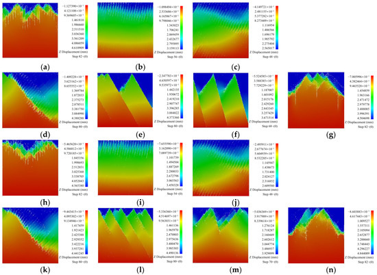 (a–g) The z-direction displacement diagrams of the CJBs with the joint distance ratio 0% and different column dip angles; (h–n) the z-direction displacement diagrams of the CJBs with the joint distance ratio 50% and different column dip angles.