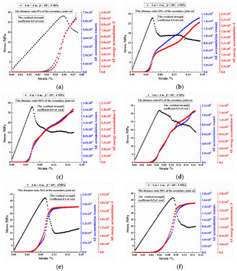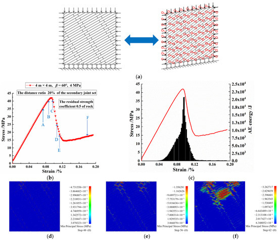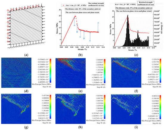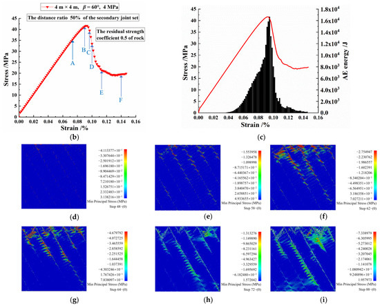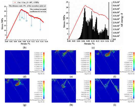 Figure 9a displays the schematic diagram of the CJBs model with β = 30° and the joint distance ratio 0%, under the lateral pressure = 4 MPa. The stress-strain curve and AE energy are presented in Figure 9b,c. Meanwhile, the minor principal stress contours at the Points A~F are depicted in Figure 9d–i, describing the phenomenon of compression shear, sliding, and cracking of joints, crack initiation, propagation and rupture. The red zones on the minor principal stress diagram reflects the high-stress concentrations.