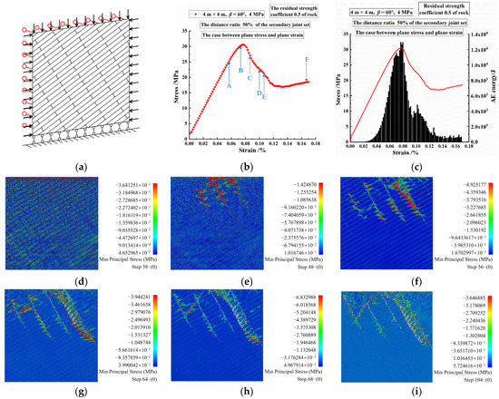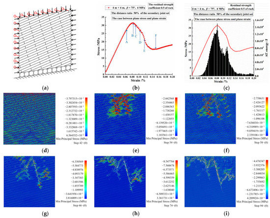Figure 11a displays the schematic diagram of the CJBs model with β = 75° and the joint distance ratio 50% under the lateral pressure = 4 MPa. The stress-strain curve and AE release are presented (see Figure 11b,c). The minor principal stress contours at the Points A~F are depicted in Figure 11d–i. Combined with Figure 11b,d–i, at the Point, the joints within the model and the secondary joint set at the middle of the model shows high-stress concentration. If the loading reaches the Point B, the secondary joints at the upper middle area of the model are damaged. In the meantime, the columns near it display obvious stress concentration. If the loading drops to the Point C, crack initiation, propagation and penetration occur near the secondary joint set at the upper middle part of the model. In addition, there is an oblique shear fracture zone between the secondary joint sets. If the loading continues to decrease to the Point D, near the middle of the model, crack initiation, propagation and penetration at the secondary joints develop towards the lower area of the model. Simultaneously, crack creation and stress concentration happen near the secondary joints at the right side of the model. If the loading is reduced to the Point E, fractures along the secondary joint set of the specimen are intensified. Moreover, in the right middle part of the specimen, the shear fracture zones develop and the stresses at the tips of cracks are concentrated. If the loading reaches the Point F, the crushing inside the specimen will intensify.