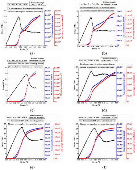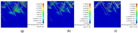Figure 12a shows the schematic diagram of the CJBs model with β = 60° and the joint distance ratio 0% under the lateral pressure = 4 MPa. Figure 12b,c displays the loading curve and AE energy. Figure 12d–I shows the minor principal stress contours at the Points A~F. Combined with Figure 12b,d–i, at the Point A, the secondary joint set within the specimen shows high-stress concentrations, with the trend of compression shear sliding. If the loading goes to the Point B, the secondary joint sets inside the specimen gradually slide, and the high stress concentrations appear near the upper end of the specimen. If the loading reaches the Point C, the cracks are created near the upper end of the specimen. If the loading continues to decrease to the Point D, near the upper end of the model, the cracks propagate, and the stresses at the crack tips are concentrated. If the loading is reduced to the Point E, the cracks further develop in the upper area of the specimen, but the stress concentration reduces. If the loading reaches the Point F, fractures intensify from the secondary joints and fracture zones. At the middle of the right side of the specimen, the cracks initiate, and the stresses are concentrated. Meanwhile, the secondary joint sets slide, are damaged, compressed, and sheared. The damage fracture zones are developed near the top and at the upper area of the specimen.