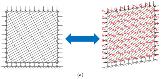 Note that the 50 mm × 100 mm models were used for verification under different load directions subject to plane strain. The inner hexagonal prisms have a diameter of 10 mm. The digital figures were used for creating the numerical samples as displayed in Table 1. The parameter values of the finite element models were determined according to the literatures [8,9,10,11,12,13,16,17,18,19] and presented in Table 2. The displacement load with a ratio of 0.005 mm/step was used until the model failure.