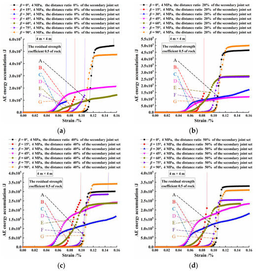 Figure 18 shows the accumulation of AE energy of the CJBs with various joint distance ratios, in the case of plane strain. As presented in Figure 18a, the accumulated AE energy corresponding to the stress peaks, occur in order of β = 30°, 45° (60°), 15°, 75°, 90° and 0°, respectively. From the perspective of their magnitude from small to large, they are in order of β = 75°, 60°, 15° (30°), 0°, 90° and 45°, respectively. As depicted in Figure 18b, the accumulated AE energy corresponding to the stress peaks occur in order of β = 30°, 45°, 15°, 60°, 75° and 0° (90°), respectively. From the perspective of their magnitude from small to large, they are in order of β = 15°, 30°, 45°, 90°, 75°, 0° and 60°, respectively. According to Figure 18c, the accumulated AE energy corresponding to the stress peaks occur in order of β = 30°, 45°, 15°, 60°, 75°, 0° and 90°, respectively. From the perspective of their magnitude from small to large, they are in order of β = 15°, 30°, 90° (0°), 75°, 45° and 60°, respectively. As displayed in Figure 18d, the accumulated AE energy corresponding to the stress peaks occur in order of β = 30°, 45°, 15°, 60°, 75°, 90° and 0°, respectively. From the perspective of their magnitude from small to large, they are in order of β = 15°, 90°, 30°, 75°, 0°, 45° and 60°, respectively.