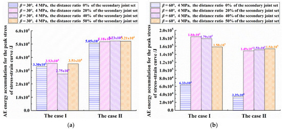 Figure 19 displays the accumulated AE energy corresponding to the stress peaks of the CJBs with various joint distance ratios, in the case of two kinds of model boundaries. Case Ⅰ is the case between plane stress and plane strain; Case Ⅱ is the case of plane strain. As depicted in Figure 19a, regarding the CJBs with β = 30° when the lateral pressure = 4 MPa under Case Ⅰ, the accumulated AE energy corresponding to the stress peaks fluctuates with the increase in joint distance ratio, in which the ratio of the highest value to the lowest is 1.284. However, for Case Ⅱ, the accumulated AE energy corresponding to the stress peaks firstly grows gently, and then changes slowly as the joint distance ratio increases, in which the ratio of the highest value to the lowest is 1.034. Furthermore, the accumulated AE energy corresponding to the stress peaks in Case Ⅱ is higher than Case Ⅰ. If the model boundaries vary from Case Ⅰ to Case Ⅱ, for the joint distance ratios 0%, 20%, 40% and 50%, the accumulated AE energy corresponding to the stress peaks grow by 53.18%, 46.53%, 89.92% and 48.35%, respectively.