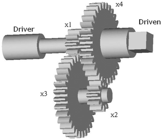 Gear train is another kind of engineering optimization issue, which have four types of variables as shown in Figure 3. This kind of engineering issue aims to reduce the teeth ratio and the scaler value of the gear. Therefore, the decision parameter consists of the number of teeth on each gear.