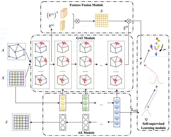 By this way, GAT and AE optimize on the same objective, making their results converge during the training process. Since the objective of the AE module and the GAT module is to approximate the target distribution , these two modules can supervise each other’s learning.