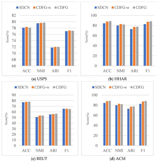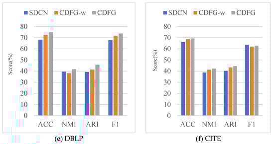 Comparison of experimental ablation effects of graph attention network module and feature fusion module. SDCN is the method using only graph convolution network and autoencoder. CDFG-w is the method with the addition of a graph attention network module. CDFG is the method with the addition of a feature fusion module.
