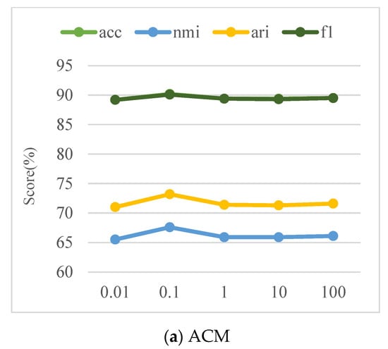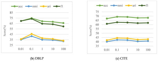 From Figure 3, we can observe that the parameter has a certain influence on the clustering effect, and all three datasets reach the optimal value when . For ACM and CITE, the trend of changes is gentler with the parameter . However, for DBLP, the variation is more significant compared to ACM and CITE. From the viewpoint of network characteristics, networks with longer average path length and network diameter and smaller clustering coefficient are more sensitive to the change of parameter .
