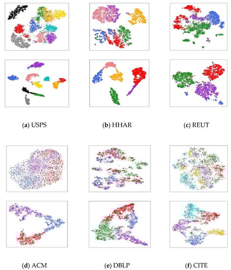 In order to verify the validity of the model more intuitively, we conduct an experiment visualizing the clustering results. For the original data, we use PCA firstly to reduce the dimension as the embedding representation obtained by CDFG, and use the t-SNE [32] method for 2D visualization. For the learned embedding results, we directly visualize the data samples in 2D space by using the t-SNE method. The visualization results are shown in Figure 4. The data points of the same color indicate the same category. The clearer the boundary between clusters composed of sample points of different colors, the better the clustering results.