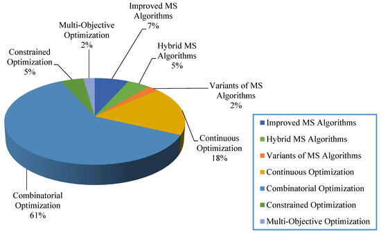 Feng et al. [94] proposed a binary MS algorithm for solving the 0–1 multidimensional knapsack problem (MKP). The self-learning flight straightly was introduced into the enhanced MS, which aims to make each individual learn. Through testing 89 different widely used benchmark instances, the results concluded that the proposed SLMS can enhance global search ability and population diversity for solving the MKP problem.