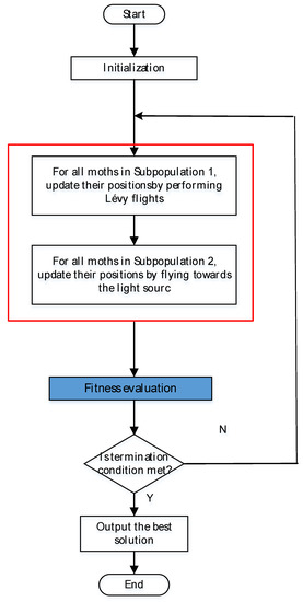 | (1) Begin (2) Initialization. randomly initialize the population P of NP moths randomly, the generation number T = 1, the maximum generation MaxGen; (3) Evaluate each individual as per its position; (4) While T < MaxGen do (5) Sort all the moth individuals according to per their fitness; (6) for i = 1 to NP/2 (subgroup 1) do (7) Evaluate by performing Lévy flights; (8) end for i (9) for i = NP/2 + 1 to NP (subgroup 2) do (10) if rand > 0.5 then (11) Evaluate by Equation (4); (12) else (13) Evaluate by Equation (5); (14) end if (15) end for i (16) Evaluate the population according to the updated positions; (17) T = T + 1; (18) end while (19) Output the best solution. (20) End. |