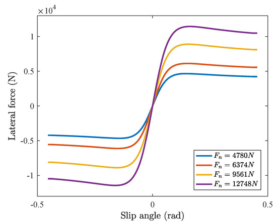 Tires are the key components of vehicles which carry all the loads and influence handling stability. Under different vertical forces , the relationship between slip ratio and longitudinal force is shown in Figure 4, and the relationship between slip angle and lateral force is shown in Figure 5. It can be seen from Figure 5 that, when the slip angle is small, the slip angle and lateral force is in an approximate linear relationship; as the slip angle increases, lateral force is saturated. That is, the small-angle approximation method [43] is no longer applicable while vehicles are fast steering at a high speed.