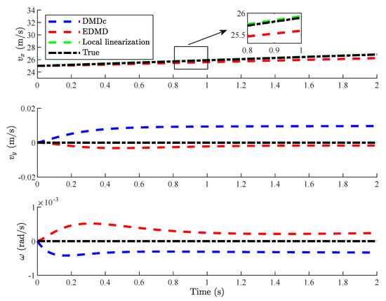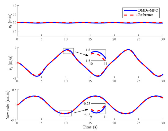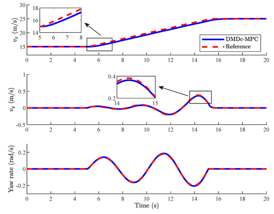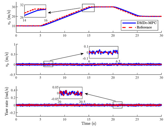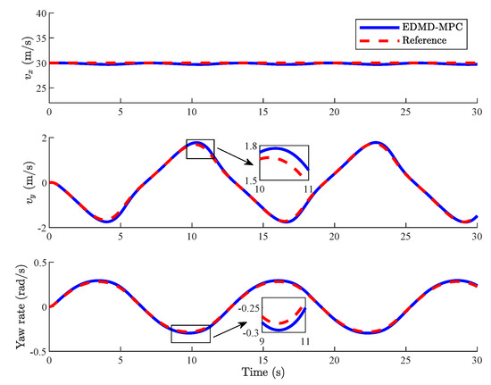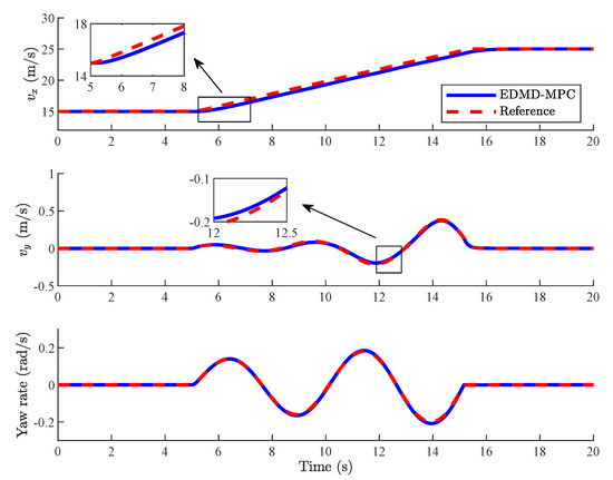 Vehicles are accelerating at the longitudinal direction and changing lanes in Case 2, where the lateral and longitudinal motions are coupled. Since the lateral velocity is low, tire does not enter its nonlinear region, and the vehicle nonlinearity is mainly reflected in the lateral and longitudinal coupling characteristics. As shown in Figure 13 and Figure 14, vehicles with both DMDc-MPC and EDMD-MPC can effectively track the reference velocity signal with small deviation while the reference lateral velocity and yaw rate are changing. Compared with [40,41], the controller proposed in this paper makes the deviation between vehicle state and the reference velocity smaller, and the RMSE of deviations is about of [41].