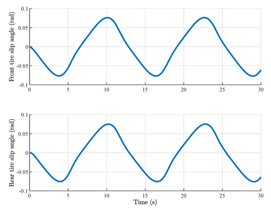 where , , , and , , , are magic formula parameters of the longitudinal tire force and lateral tire force , respectively, and are the front and rear tire slip angles, and and are the front and rear tire slip ratios. The tire slip angle and slip ratio can be calculated by