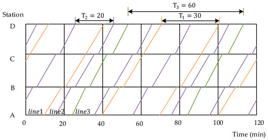 In order to solve the issues mentioned in Section 1.1 and jointly optimize the supply-to-demand relationship and energy consumption, the line plan and timetable would be optimized simultaneously. The line plan, which is composed of lines, is one of the most basic elements for rail transit operations. A line represents a series of trains that have the same route, stopping pattern, frequency and cycle length, where the route is in a high-level infrastructure graph, ignoring the precise details of the platforms, junctions, etc. [38]. The train timetable determines the arrival and departure time of trains at stations based on the line plan. In the multi-cycle train timetable, trains belonging to different train lines have an identical cycle length, with a designed route and stop plan [38].