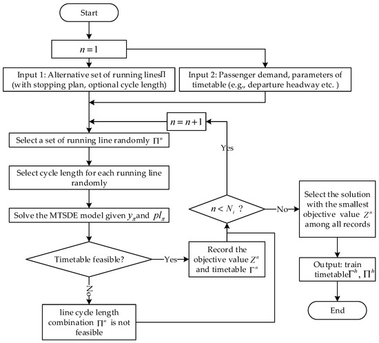For ensuring that the resulting multi-cycle train timetable can meet the passenger demand while being easy for passengers to remember, this paper constructs a candidate set of lines with optional cycle lengths (i.e., 30 min, 40 min, and 60 min, which are convenient for passengers to remember) and uses random search to solve the model. Such optional set-based algorithm framework is shown in Figure 2. In step 1, basic information of line, passenger demand and parameters of timetable are input. In step 2, the model selects a set of line from the input lines randomly, which determines the value of s. Then, for each selected line, select a cycle length from the optional cycle lengths, which determines the value of s. In step 3, solve the MTSDE model and obtain feasible solution. Store the solution into the result set. This process repeats times, and in the final step, we select the solution with the best objective value as the final solution.