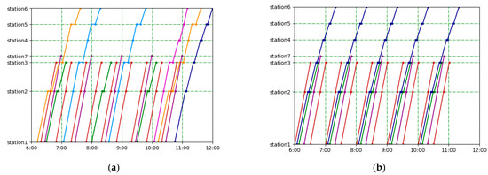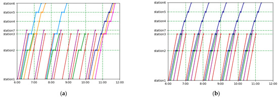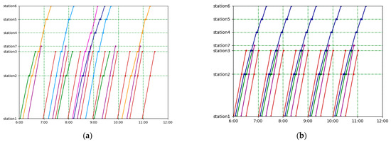 In terms of the objective of timetable optimization, Niu et al. [16] proposed a set of quadratic and quasi-quadratic objective functions to accurately formulate the total waiting time under the minute-related demand and hour-related demand of different origin–destination (OD) pairs so that the total station passenger waiting time is the smallest, and a general advanced solver is used to solve the model. The cyclic train timetable problem usually considers passenger-related expenses as the objective function, such as a minimum train waiting time [17], guaranteed maximum passenger transfer waiting time, reduction in the maximum train dwell time [18] and maximum passenger demand satisfaction [19]. Yin [20] minimized the weighted value of the total train travel time and the total passenger waiting time, considering vehicle turnover as the objective function.