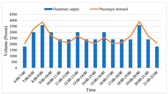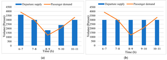 In order to describe the relationship between passenger demand and train supply more accurately, it is necessary to divide the time of day into multiple time periods and match the passenger demand and train supply in each time period, so as to achieve the matching of supply and demand throughout the whole-time horizon. Thus, in Equation (2), represents the average number of service passengers at time by line . Then, calculates the difference in passenger demand in station and the train supply in time duration .