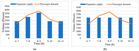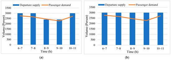 It can be seen from Figure 11 that the supply level of each time period of the obtained train operation diagram changes with the change in the passenger flow demand, which can satisfy the passenger flow demand of each time period to a large extent. From Table 17 and Table 18, we can see the distribution of the supply and demand matching under each time period. Specifically, the supply–demand matching degree is 91.16% during the morning peak period (7:00–8:00) and 92.38% during the evening peak period (19:00–20:00), which means that the model could satisfy the passenger flow demand effectively. Among them, the highest supply and demand matching degree is 94.52% during 10:00–11:00, while the lowest supply and demand matching degree is 84.16% throughout the whole day. To a large extent, it can meet the passenger flow demand at different times throughout the day. At the same time, the matching of the supply and demand also indicates that the model in this paper can obtain the train timetable that can meet the passenger flow demand.