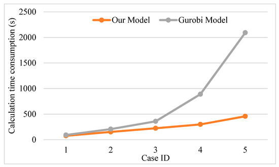 Table 19 shows the performance metrics of the model for the different cases. It can be seen that compared to other timetables, the demand satisfaction rate of the multi-cycle timetable considering the energy consumption does not decrease obviously, but the number of trains decreases significantly. From the values of the train vacancy rate, we can see that the vacancy rate of the original timetable is 24.32%, while after optimization, the vacancy rate of the multi-cycle timetable is only 6.03%, which greatly increases the operational efficiency. From the values of the total running time and energy consumption, the multi-cycle timetable performs the best. Although the multi-cycle timetable without considering the energy consumption has saved more running time compared with the original timetable, it is still inferior to the timetable where the energy consumption is considered.