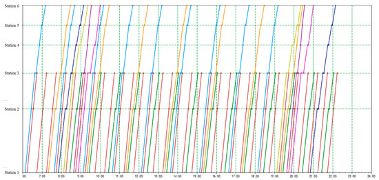 It can be seen from Figure 12 that all the trains run according to the cycle length in Table 20, and the train diagram conforms to the characteristics of the multi-cycle timetable and has a strong regularity. The multi-cycle timetable can provide a certain reference for the intercity multi-cycle train operation organization.