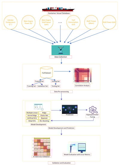 To investigate the energy efficiency of a container ship, various data-driven models were used to predict shaft power and fuel consumption factors, and Figure 1 depicts the study’s approach. The first 700 days of voyage data from a container ship were gathered for the estimating procedure. These figures were compiled from 75 distinct data sources aboard, including various equipment. Figure 2 shows the findings of the Pearson Correlation Analysis. The study revealed that several factors in the data set had a higher correlation with the shaft power and fuel consumption variables. The correlation matrix was examined, and data with poor correlation with these variables were excluded from the analysis and estimation procedures. To better comprehend the relationship between power and fuel consumption, a pair plot was created, with the highest correlations illustrated in Figure 3. The data set was randomly picked by the computer as training data (66 percent) and test data (33 percent) and separated into two parts after it was processed [45]. The training data was utilized for training the algorithms, while the remaining test data was not used. The outcomes of the algorithm-based prediction method were compared to the actual test data. The estimation was done using data-driven techniques such as Multiple Linear Regression, Ridge Regression, Lasso Regression, Kernel Ridge Regression, Elastic Net, Artificial Neural Network, XGradient Boosting, Deep Neural Network, and Bayesian Regression. Since the expected results were not obtained from the estimation in the first stage of the prediction process, the parameters of the algorithms were changed to increase the algorithm’s performance. To validate the findings and detect overfitting, the K-Fold Cross Validation method was used [46]. The algorithm’s results were then compared using error metrics such as Root Mean Squared Error (RMSE), Mean Absolute Error (MAE), and Coefficient of Determination (R2) [47]. Figure 1 shows the steps done in further detail. This section is organized as follows; Section 2.1 and Section 2.2 explain the data collection and data pre-processing phases. Section 2.3 describes the stages of model development and prediction. Validation and evaluation techniques are introduced in Section 2.4.