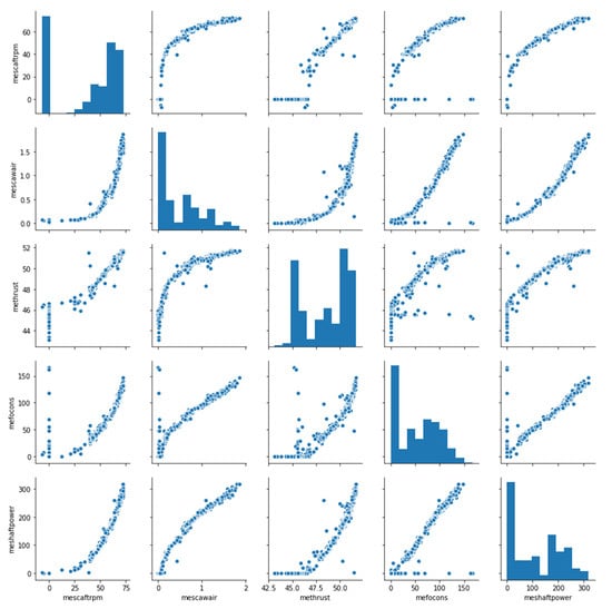 The data of main engine shaft speed (rpm), main engine scavenging air temperature, main engine thrust pad temperature, and main engine fuel oil consumption form a strong correlation with the power, which can be noticed when the correlation matrix is studied. The pair plot in Figure 4 provides a more detailed examination of the association between these variables.