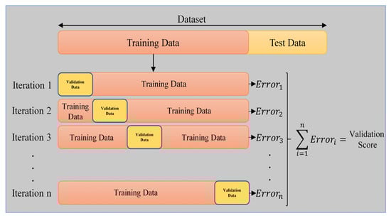 K-Fold Cross-Validation was used as the validation method to verify the success of the algorithm in estimating and detecting the overfitting problem [75]. As can be seen in Figure 7, the data set is divided into five equal parts. One of these parts was used for validation, one was used as test data, and the other three were used as training data [76]. The process continues until all data in the data set is processed. The average of the results obtained from the operations performed was taken as the validation score [77].