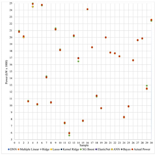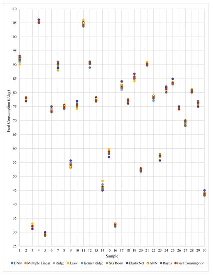 When Table 5 and Table 6 are compared to Table 7 and Table 8, it is clear that the algorithms do not produce satisfactory results in the first simulations. Therefore, for simulations related to power estimation, while the Ridge achieved 1.237432 RMSE, 1.512512 MAE, and 0.659222 R2 values in the initial simulations, parameter optimization resulted in error metric values of 0.500782 RMSE, 0.517583 MAE, and 0.999965 R2. When the Lasso is analyzed, 1.264545 RMSE, 1.127521 MAE, and 0.775724 R2 can be obtained as a result of the first simulations, while these values are updated as 0.299883 RMSE, 0.260465 MAE, and 0.999971 R2 after parameter optimization. In the first simulations, the error metric values that were 0.009053 RMSE, 0.095750 MAE, and 0.993211 R2 in the XGradient Boosting model reached 0.129474 RMSE, 0.114669 MAE, and 0.999871 R2. If a comparison is made for the Elastic Net method; It can be said that the values of 1.203749 RMSE, 1.097155 MAE, 0.647199 R2 reached 0.082140 RMSE, 0.154781 MAE, 0.999991 R2. When the ANN algorithm’s performance values before and after optimization are compared, it can be seen that the values of 0.801357 RMSE, 0.892518 MAE, and 0.703928 R2 have been updated to 0.001547 RMSE, 0.001621 MAE, and 0.999992 R2. When the simulation results of the DNN algorithm are compared, it can be said that the error metric values of 0.684111 RMSE, 0.827112 MAE, and 0.724955 R2 reached 0.000001 RMSE, 0.000987 MAE, and 0.999999 R2. Similarly, when the fuel consumption estimation simulation results are examined, the algorithms can be said to have produced more successful results after the parameter tuning process.
