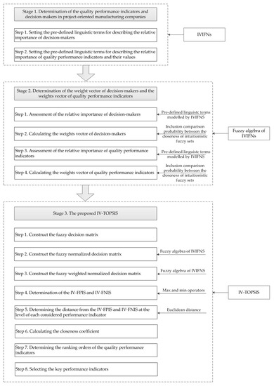 The main objective of this research may be interpreted as the selection of KPIs among a finite set of PIs through the DMs’ assessment and the determined rank of PIs by using the proposed IV-TOPSIS. To deliver the main objective, a set of activities needs to be met: (a) modeling existing uncertainties by the IVIFNs; (b) assessment of the relative importance of the DMs in a direct way, and the determination of the weights vector of DMs based on the inclusion comparison probability between the closeness intuitionistic fuzzy sets [36,37]; (c) determination of weights vector of PIs based on the integration of an interval-value fuzzy weighted geometric operator (IVIFWG) [38] and the inclusion comparison probability between the closeness intuitionistic fuzzy sets [36,37]. By achieving the main objective of the research, project-oriented manufacturing companies can measure appropriate KPIs and enhance their value, so consequently, the cost of poor quality should be reduced.