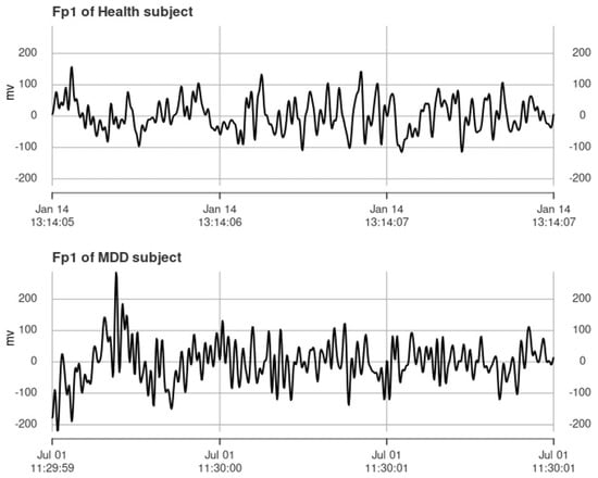 EEG signals of Fp1 channel from two subjects—depressed (MDD) and healthy subject—over about 3 min.