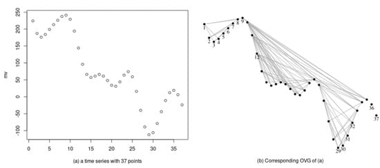 Figure 3 shows an OVG associated with a time series collected from a depressed subject (ID: MDD S3 EC) recorded in the EEG database. The number of time points in Figure 3a is 37. Node 3 can be obliquely seen from node 1 or 5, but it is not visible from node 2 or 4. Thus, an edge is connected between nodes 1 and 3 and not between nodes 2 and 4.