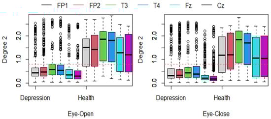 To evaluate different graph features from the three group subjects, Figure 4 shows the statistical result plots on D2 from six channels: Fp1, Fp2, T3, T4, Fz, and Cz. It was found that the MDD patients had lower D2 values than the healthy people in all six channels for the both eyes-open and eyes-closed statuses.