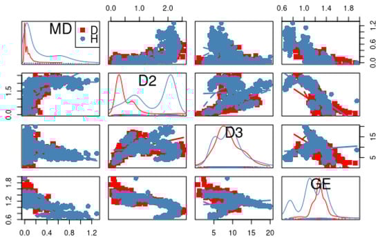 In addition, a correlation matrix was analyzed based on four features, as shown in Figure 5. The four features were the mean degree (MD), degree of 2, degree of 3, and graph entropy (GE) from 19 channels of two groups of subjects: MDD and healthy (H). To obtain good visualization, the degree of 2 (D2) was divided by 300, and the degree of 3 (D3) was divided by 300 as well.