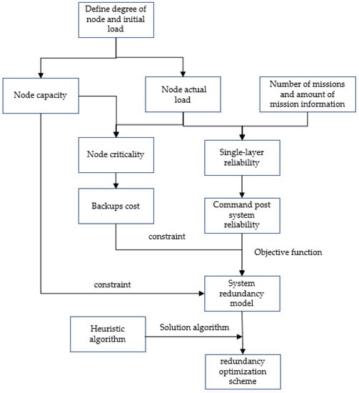 We divided the command post system into four layers of different complex networks. Based on the load capacity model, we used the degree of the node to replace the betweenness to define the initial load of the node and to obtain the node capacity and actual load. Then, we defined the single-layer network reliability, the command post system reliability and the node criticality. The higher the node’s criticality, the higher the cost. Finally, we proposed a redundancy optimization model for the single-layer network and command post system, which can obtain the optimal number of backups to maximize system reliability. The approach flowchart is shown in Figure 1.