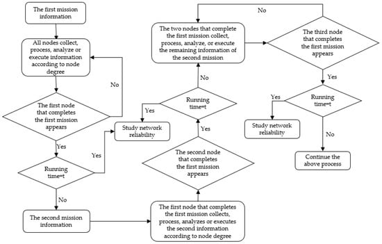 Step 4: If the running time reaches the specified time t, calculate the network reliability; otherwise, the two nodes that complete the first mission collect the remaining information of the second mission.