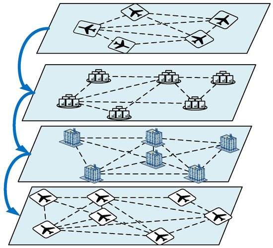 The command post system includes four links: intelligence acquisition (IA), intelligence processing (IP), decision control (DC) and response execution (RE), and each link exists independently. The command post system can be regarded as a multilayer network system; each layer of the network represents a link in the system. The command system is goal-oriented to complete the command mission. Therefore, each layer of the network can be assumed to be a separate mission stage, and different missions need to be completed in different stages, as shown in Figure 2.